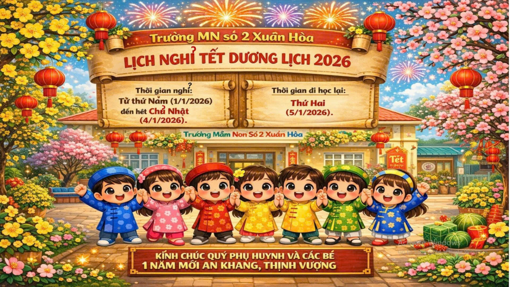 Nhân dịp năm mới, Trường Mầm Non số 2 Xuân Hòa xin kính chúc Quý phụ huynh và các bé **Một năm mới an khang, hạnh phúc, nhiều niềm vui và thành công**. Chúc các con có một kỳ nghỉ lễ thật vui tươi, ấm áp bên gia đình.
