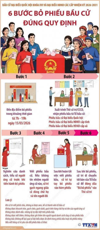 Bầu cử đại biểu Quốc hội khóa XVI và đại biểu Hội đồng nhân dân các cấp nhiệm kỳ 2021-2026 là quyền và nghĩa vụ thiêng liêng của mỗi công dân. Để đảm bảo ngày hội toàn dân diễn ra đúng quy định và trang trọng, Hội đồng Bầu cử quốc gia đã ban hành hướng dẫn chi tiết quy trình 6 bước bỏ phiếu gồm: đến khu vực bỏ phiếu; xuất trình giấy tờ và nhận phiếu bầu; nghiên cứu danh sách, tiểu sử người ứng cử; viết phiếu bầu; Bỏ phiếu vào hòm và xác nhận đã bỏ phiếu.